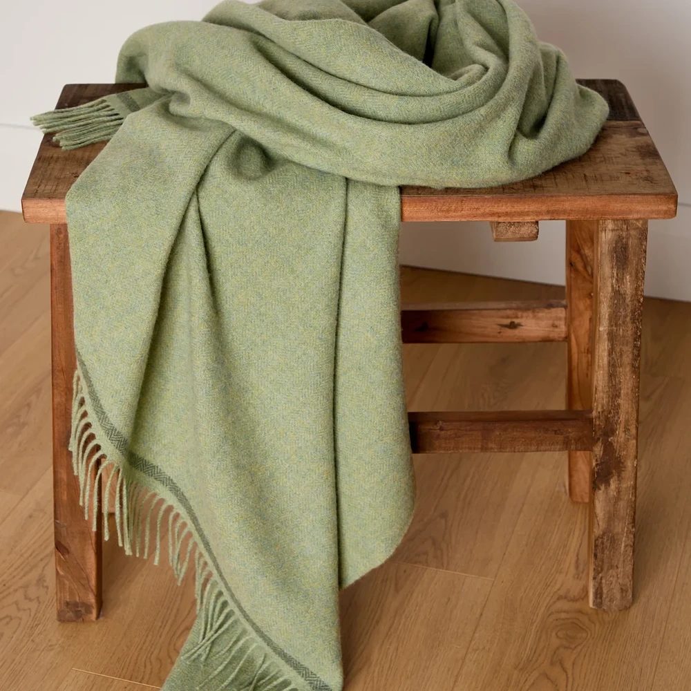 Dieser luxuriöse Plaid wird in der Grafschaft Mayo in Irland gewebt und weist ein blassgrünes Design mit einem kontrastierenden, dunkelgrünen Streifen auf, das an die tiefen Farbtöne der Umgebung des Flusses erinnert. Mit der weichen, hochwertigen Lammwolle spendet er Wärme und Eleganz und würdigt die irische Handwerkskunst sowie die stille Schönheit der Natur.